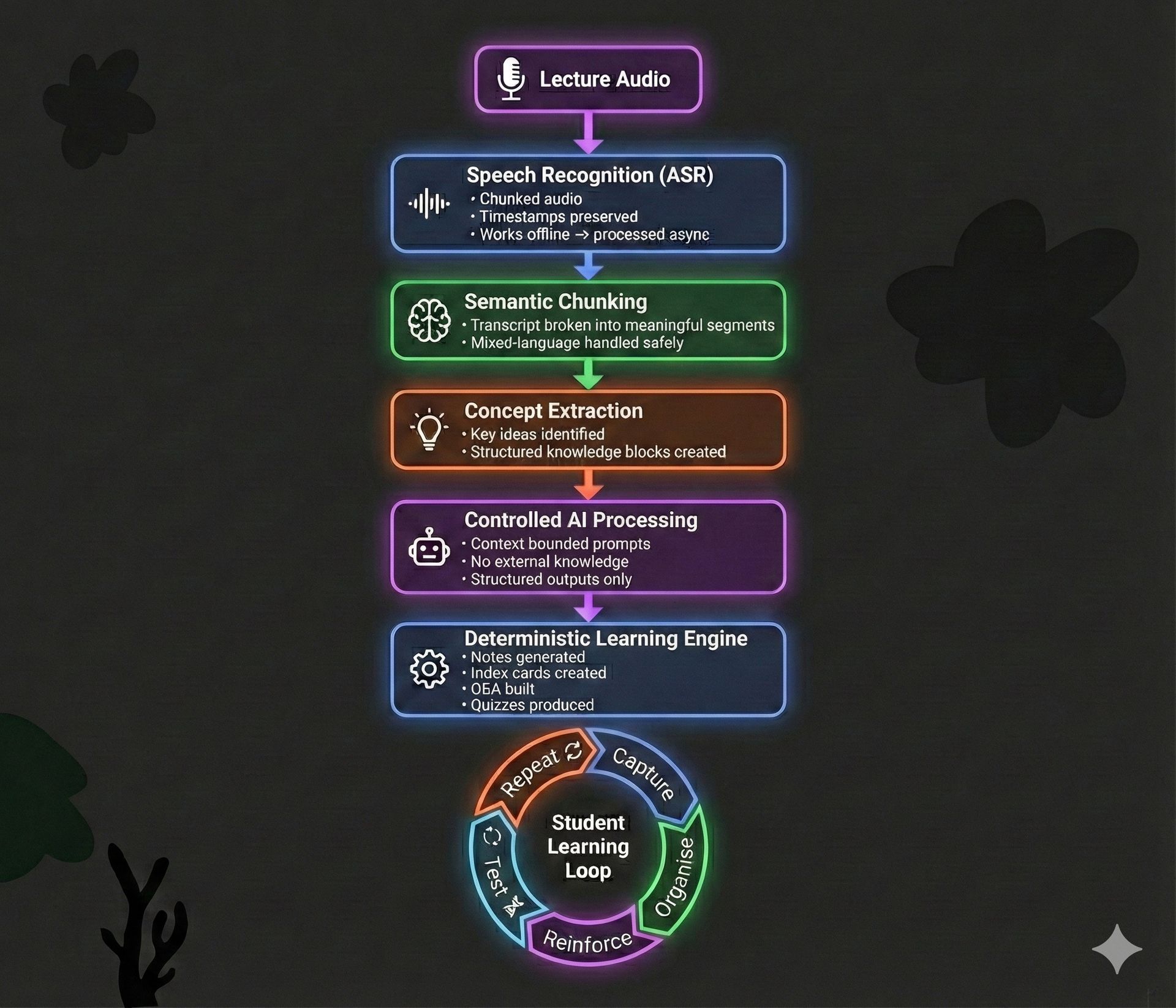Lecture audio is transcribed using Whisper-class speech recognition, captured in overlapping chunks with timestamps and confidence preserved. Instead of sending full transcripts to large language models, Nottu first semantically chunks the content and extracts concepts. Only these structured segments are passed to the AI, using tightly bounded prompts and structured outputs. This prevents hallucinations, avoids over-summarization, and keeps learning grounded in the student's actual lecture.